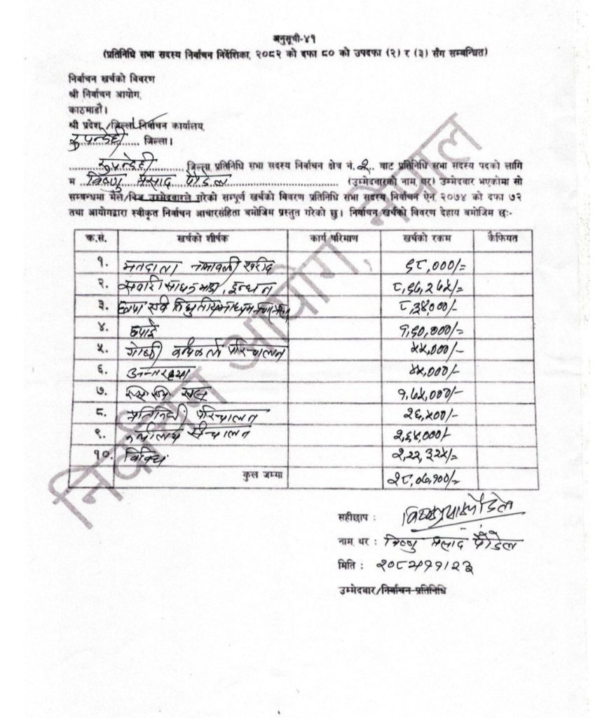 नेकपा (एमाले)का नेता तथा रुपन्देही क्षेत्र नम्बर २ बाट प्रतिनिधिसभा सदस्यमा उम्मेदवारी दिएका पराजित उम्मेदवार विष्णु पौडेलले आफ्नो चुनावी खर्चको विवरण निर्वाचन आयोगमा बुझाएका छन्।